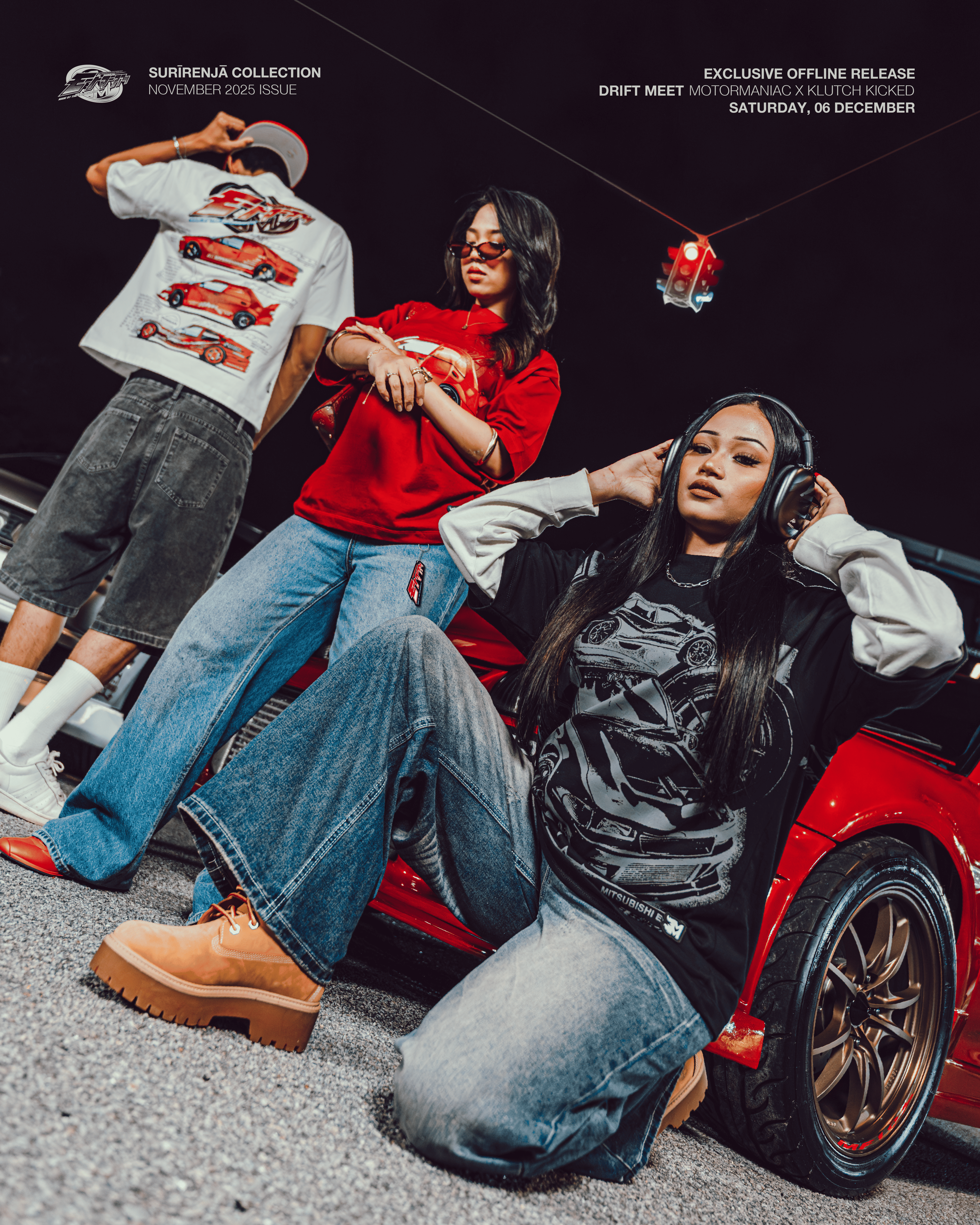 Inspired by Japanese street and motorsport culture, Surirenja represents the moment where discipline meets aggression, where precision driving, sharp decisions, and unfiltered expression coexist. This collection draws from late-night runs, circuit tension, and the silent understanding between machine and driver.
